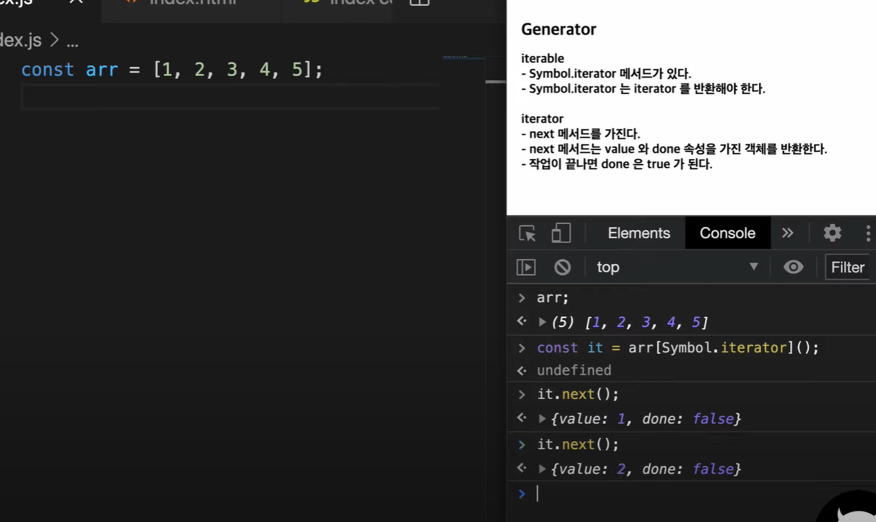 - console.log 에서 구조분해할당을 사용하였는데, for of 와 마찬가지로 done이 true가 될 때까지 값을 펼쳐주는 역할을 한다.